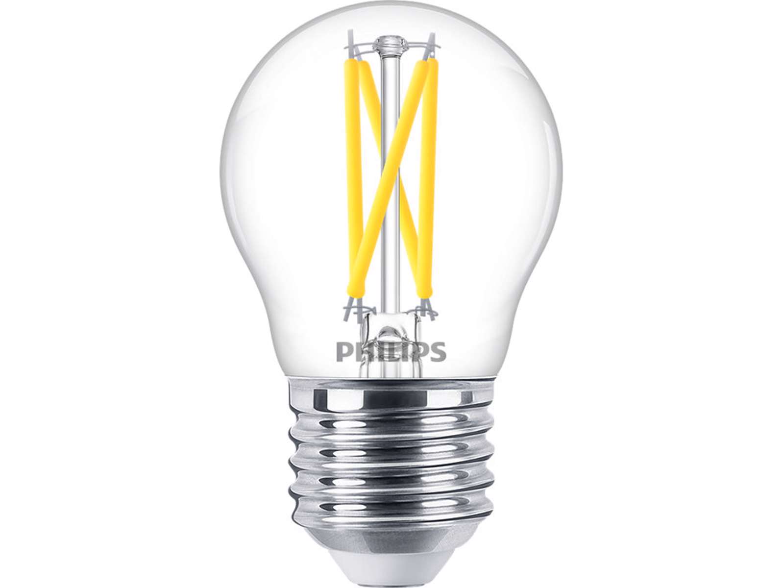 Philips Master Value LEDluster E27 Krone 2.5W pæren giver et ekstra varmt hvidt lys (2700K) med en lysstyrke på 340 lumen og har en lang levetid på op til 15.000 timer. Denne dæmpbare pære med filamentteknologi er perfekt til at skabe en stilfuld og funktionel belysning i hjemmet og butikker.