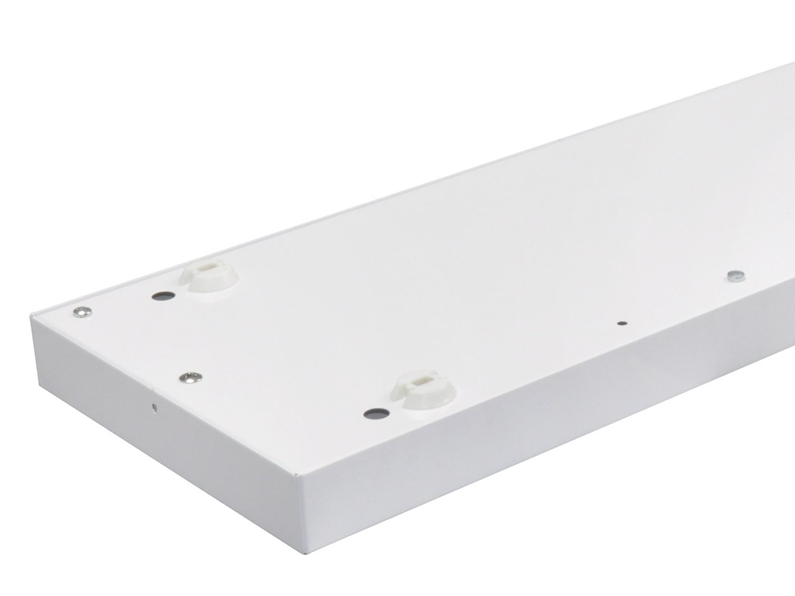 Armaturet har et elegant lavprofil-design og leveres i hvidlakeret stål (RAL 9003). Det kan monteres direkte på loft, væg eller som nedhængt løsning og passer derfor ind i mange typer erhvervsbyggeri, hvor der ønskes et diskret udtryk med høj funktionalitet.