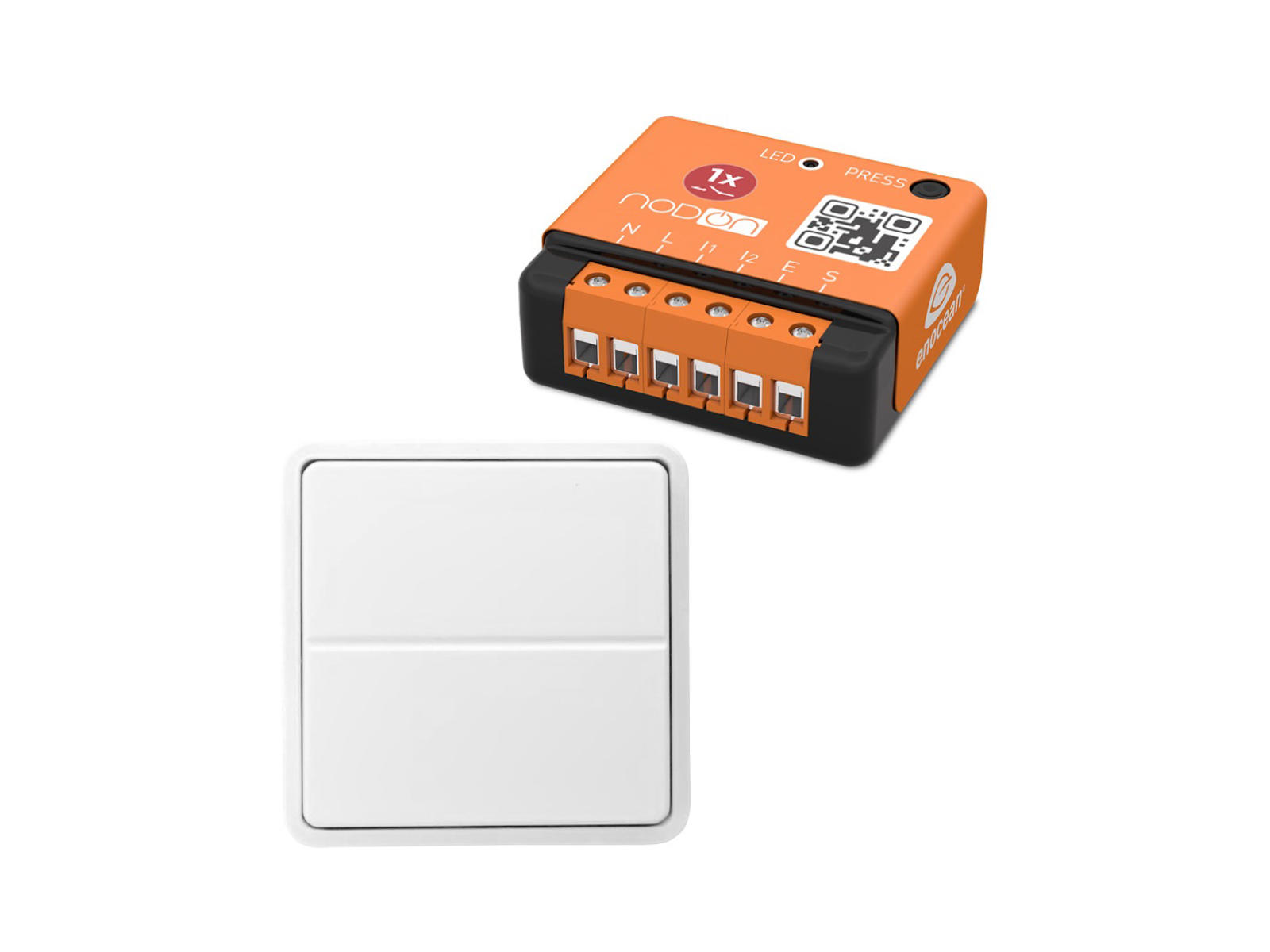 Sættet består af et relæ og et batteriløst EnOcean-tryk, som allerede er parret fra fabrikken. Det betyder, at du blot skal montere relæet og trykket – derefter er løsningen klar til brug uden ekstra konfiguration.