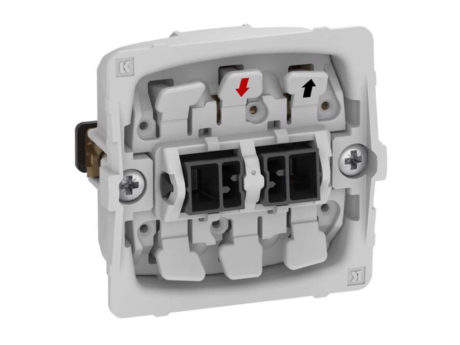 Montagen sker primært via de medfølgende klostykker og sekundært via skruer i monteringsrammen, hvilket sikrer en stabil installation. Afbryderen er uden afdækning, så du selv kan vælge den ønskede FUGA ramme og tangent, der passer til din indretning.