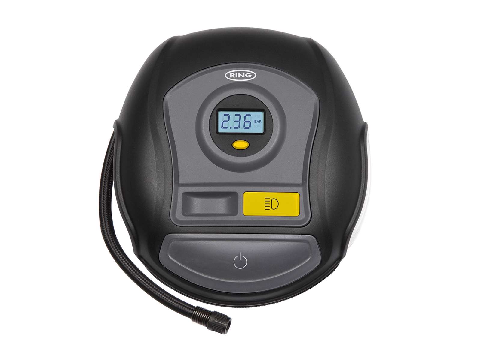 Digital compact 12V dækpumpe RTC400 med 50 cm dækslange. Ledning 3 m. Leveres med 3 adaptere 1 stk. til cykel 1 stk. til bolde og en universal