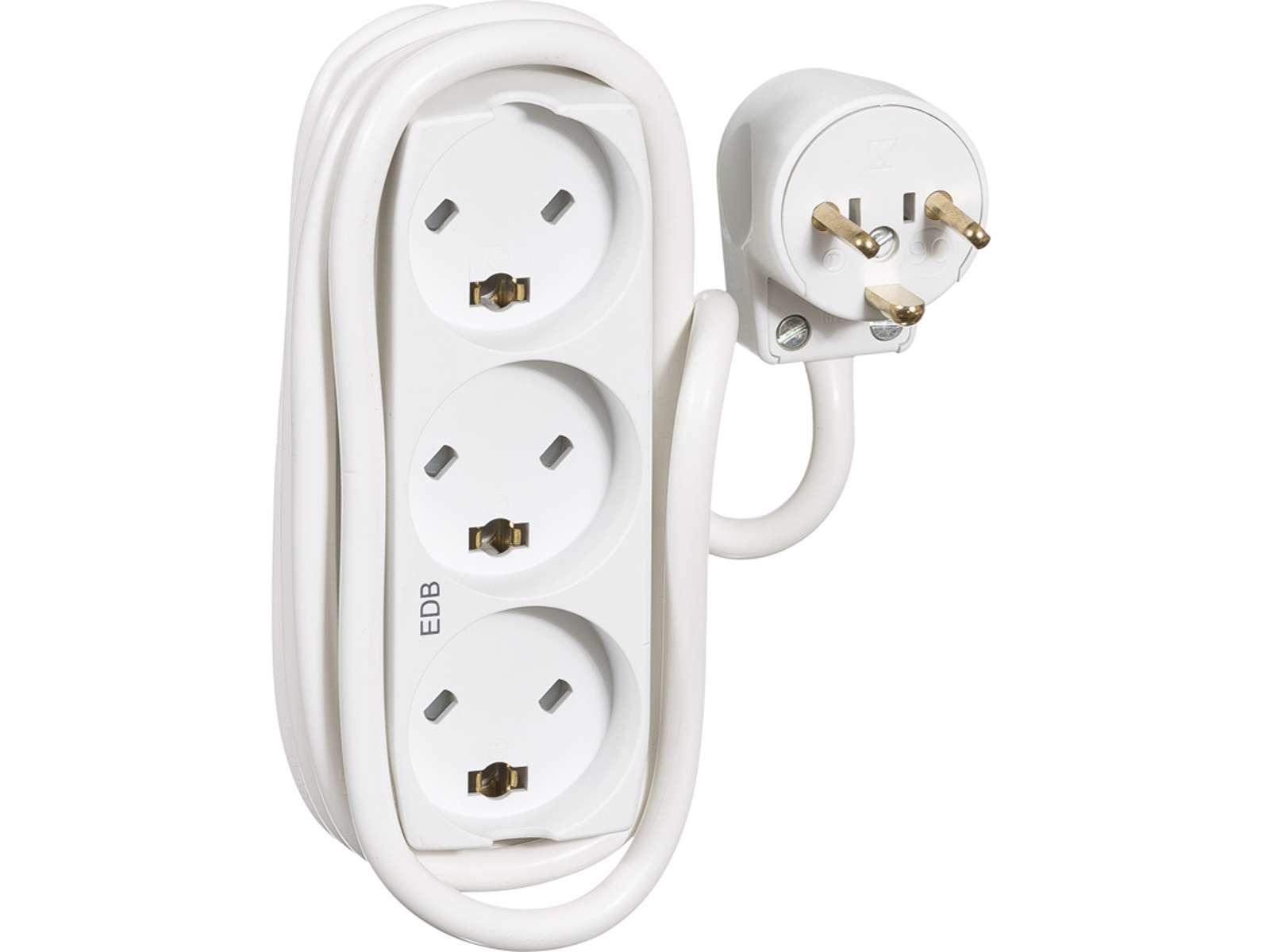 3-Stikdåse m. jord, 3 m ledning – Hvid – Til EDB-stikpropper