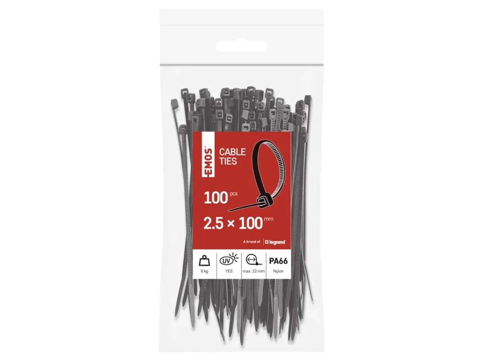 EMOS kabelstrips 100×2,5 mm i sort giver kompakt fastgørelse i PA66 materiale med høj mekanisk styrke.