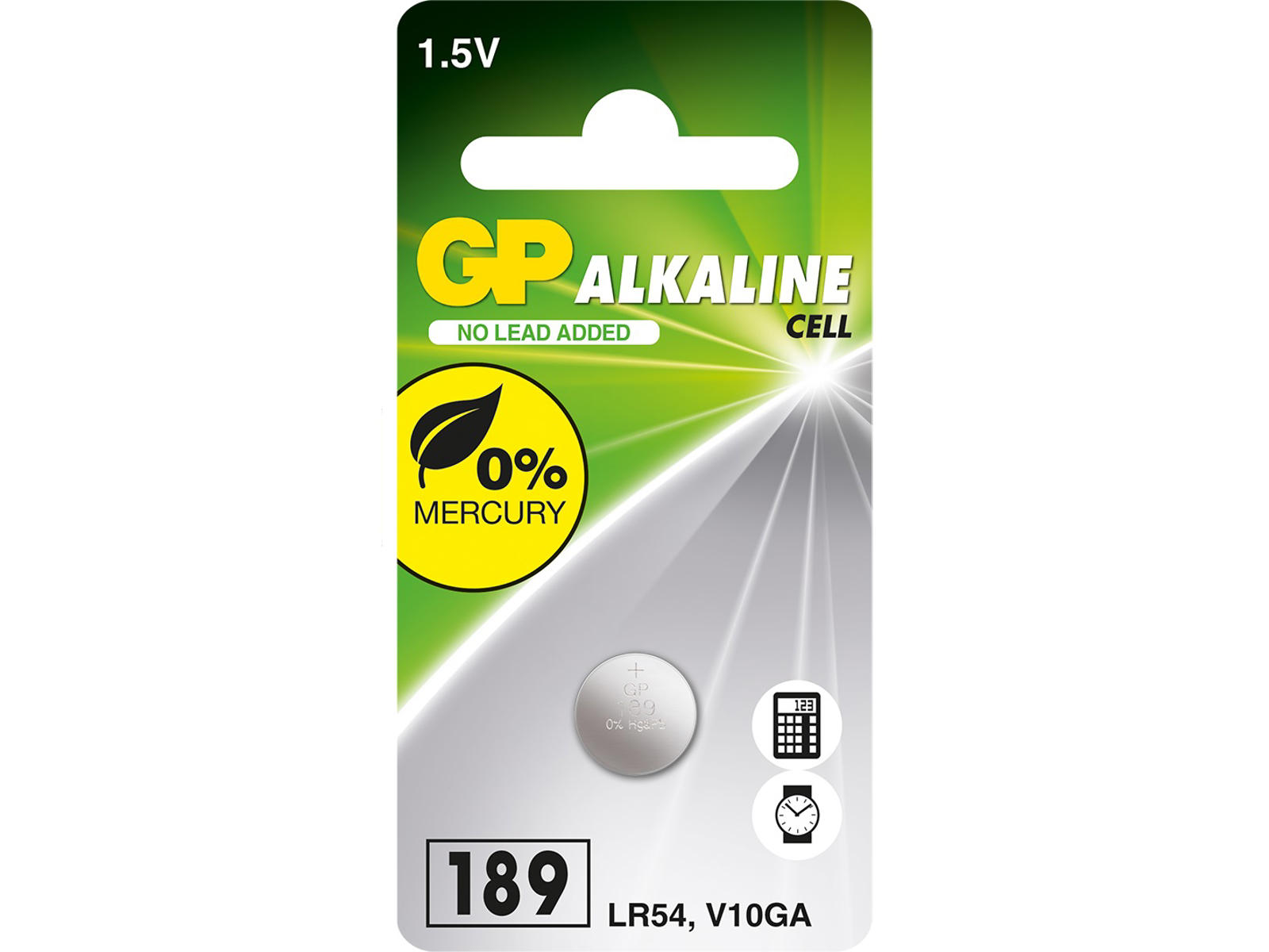 GP Alkaline 189 (LR54) er et 1,5 V alkalisk knapcellebatteri, udviklet til at levere stabil og driftssikker strøm til små elektroniske enheder med lavt til moderat strømforbrug. Batteriet anvendes bl.a. i fjernbetjeninger, legetøj, termometre, lommeregnere og præcisionsudstyr, hvor der kræves pålidelig og ensartet spænding.