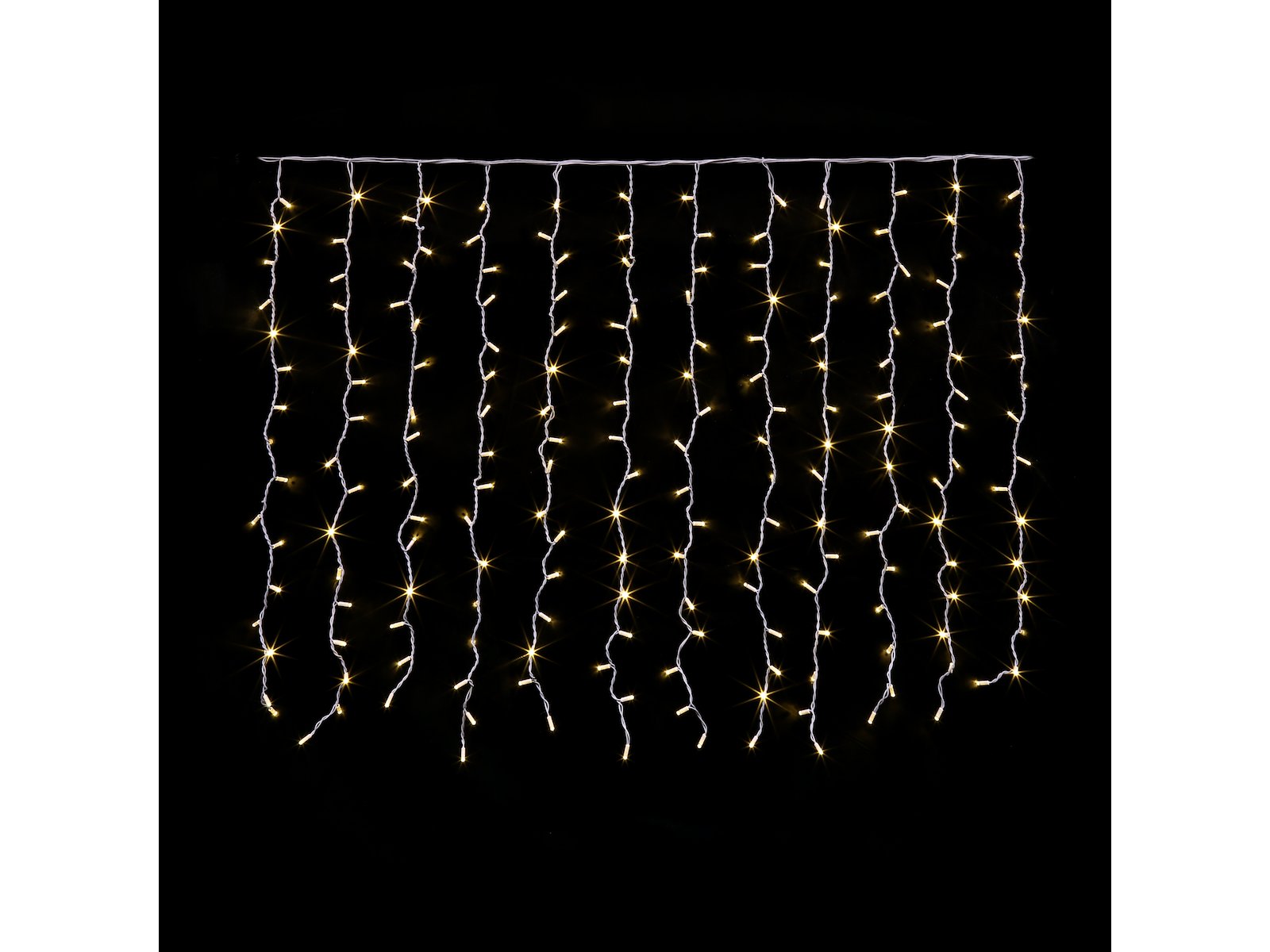 Det varme lys giver en indbydende og hyggelig atmosfære, mens det hvide kabel giver et stilrent og diskret udtryk, der passer særligt godt til lyse overflader. IP44-beskyttelsen sikrer, at gardinet kan bruges både indendørs og udendørs i beskyttede områder, hvilket gør det fleksibelt og holdbart.
