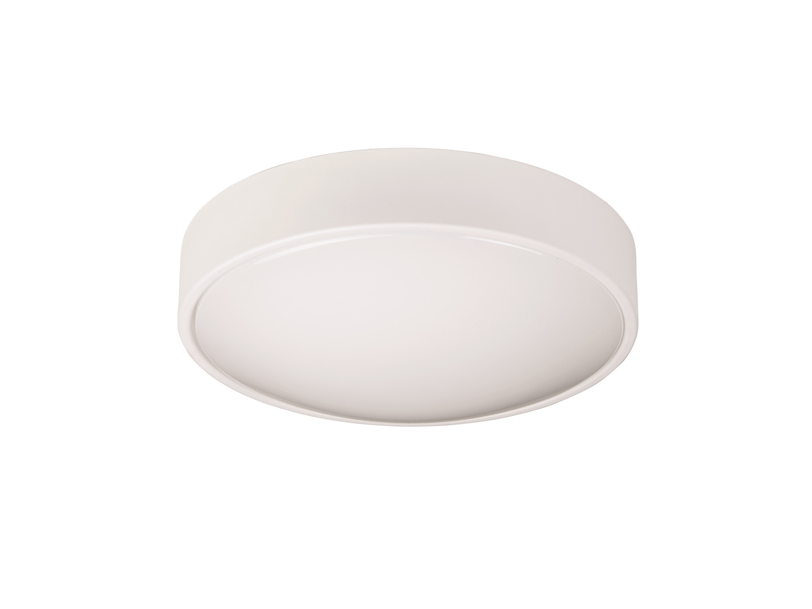 Plafonden er udført i hvid pulverlakeret stål med et opal akryldæksel med bajonetlås, der både giver et stilrent look og øget modstandsdygtighed mod hærværk. Rammen ligger tæt mod kanten, hvilket gør armaturet sværere at beskadige.