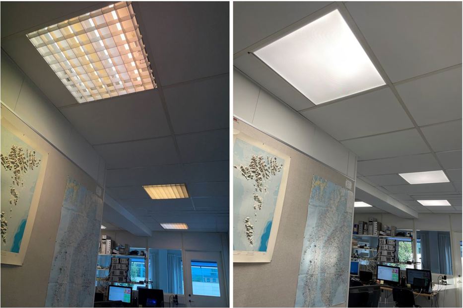 Vi satte hurtigt sagen i gang, og på få dage var vores montør i fuld gang med at opgradere belysningen. De gamle armaturer med fire lysstofrør blev fjernet og erstattet med moderne LED-paneler, der leverer kraftigere og mere effektiv belysning. Faktisk kunne vi reducere antallet af armaturer, da de nye leverer et bedre lys med færre enheder.