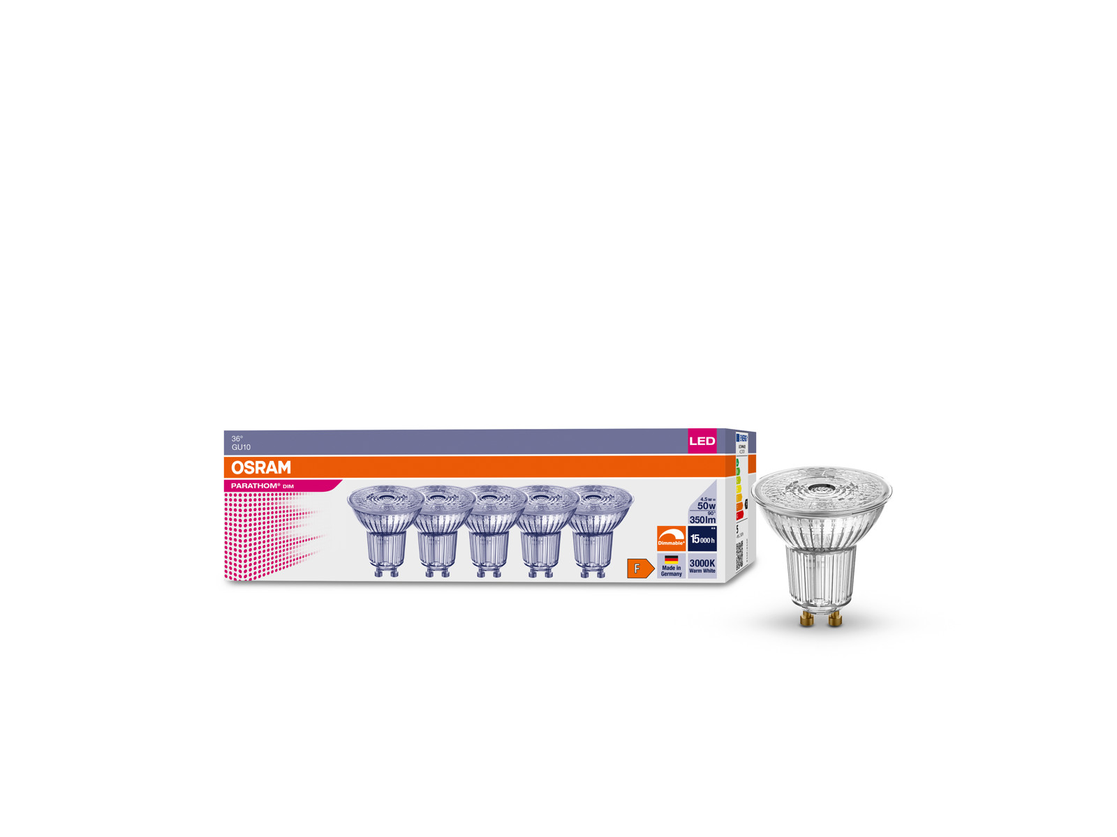 5-Pak Parathom LED - Par16 / GU10 - 4,5W (50W) - 230 Volt - 3000 Kelvin - Lumen 350 - 36 gr. Lysspredning - Dæmpbar.