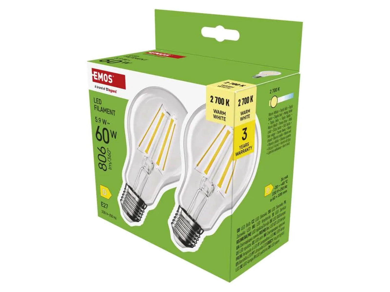 EMOS LED Std. 5,9W (60W) Klar 2700K E27 2 PAK