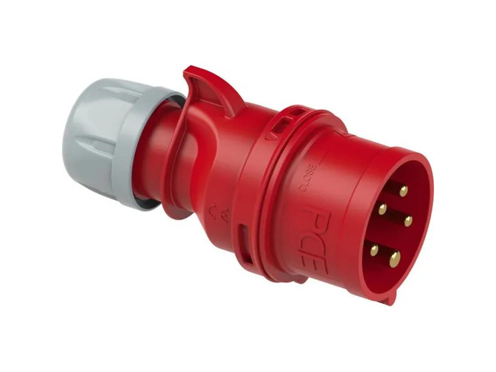 Den røde CEE-farvekode angiver brug til 400V installationer, og beskyttelsesklassen IP44 gør stikproppen modstandsdygtig over for støv og vandsprøjt.