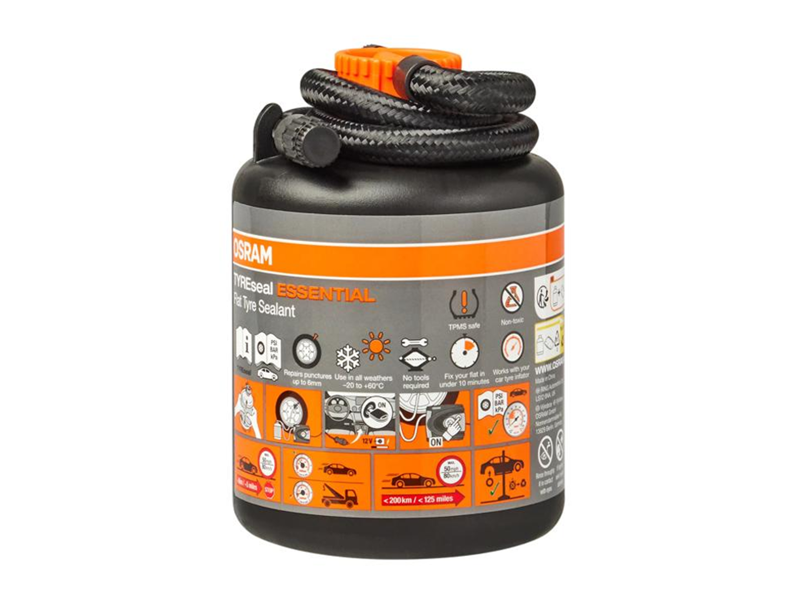 OSRAM TYREseal ESSENTIAL er et professionelt tætningsskum, udviklet som direkte erstatning for bilens originale dækforsegler. Skummet er TPMS-sikkert, fremstillet efter OE-specifikation, og anvender den nyeste partikelgel-teknologi, som effektivt tætner huller op til 6 mm.
